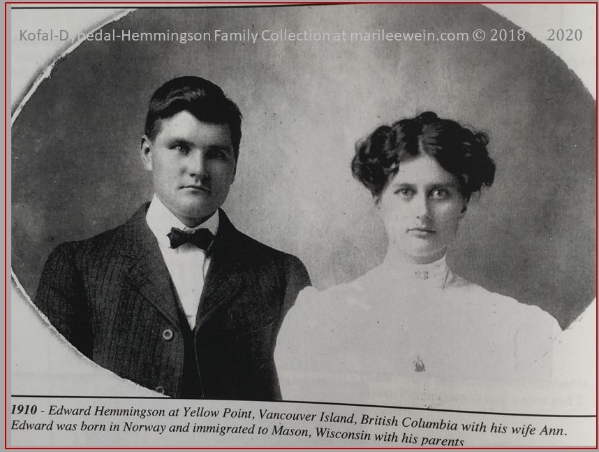 Confirming and Confounding Timeline; 1905: Anna also said that she naturalized in the US in 1905, in that 1920 Census. That would mean she was in the US by 1903, but, where? On the Hemmingson side, Ole had died in 1903, and neither Ed, nor his sister Henrietta Church were around for the June 1905 Wisconsin State Census. Henrietta likely went to Washington State; Ed may have tagged along, or gone logging in B.C. Matt, on the other hand, had just gotten married in Mason, WI. His Memoirs show the couple arrived in B.C. in June of 1906, and returned to Mason that September.