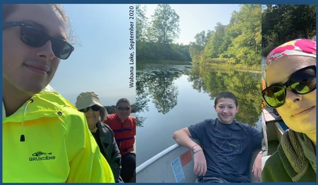 Click here for an enlargeable PDF of Wabana and surrounding water. We spent our time reminiscing, boating and hiking. Plus, enjoying Lorrie’s family recipe Banana Bread (her Mom’s). Memorably, we followed an almost imperceptible and shallow channel between Wabana and Bluewater Lake. Signage cautioned to leave no wake. Our passages were wakeless, deliciously quiet, so worth the slow and deliberate.