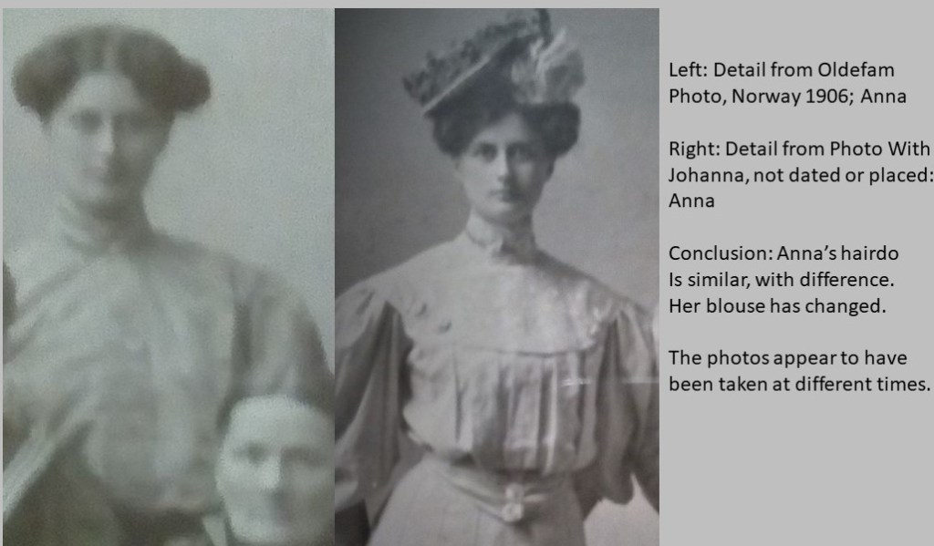This photo seems not to have been taken at the Gerlach studio since Johanna’s clothes are no match for the one, that was. Nor does it seem taken at the same time as the Oldefam photo in Norway. That can be judged by viewing the side by side details of both, below.