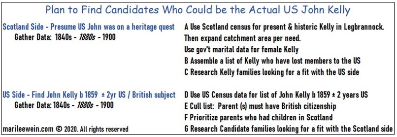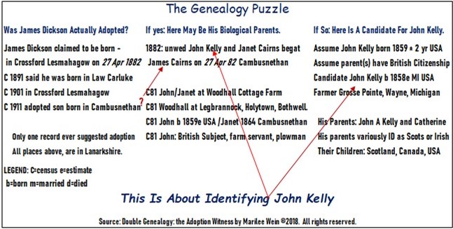 Wait! Where is John Kelly of Carstairs in that picture? Yes, we shall sometimes dub him “John 1834”. Truth is, we first had to conjure him, or an alternate, as a relative whom US John was venturing to visit. After all, very few young American men of the 1880s left their home of grand opportunity, for Scotland’s deteriorating conditions. Since US John had to have a British citizen parent, we figured one could be Scottish. An Irish settled in Scotland would work as well. The fact is, with so little known on him, we had to get lucky with this ploy, or enjoy our empty hand. We made a plan, hopefully to flush out supposed kin. Then we would have to prove them.