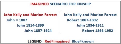 While our imagined scenario for kinship is purely fanciful, it is surrounded by documented evidence and reveals our research direction on proofs being sought. Of John Kelly and Marion Forrest, we can say that circumstances found them in the Glasgow area in the early 1800s. They could well have had a son John, before Robert.