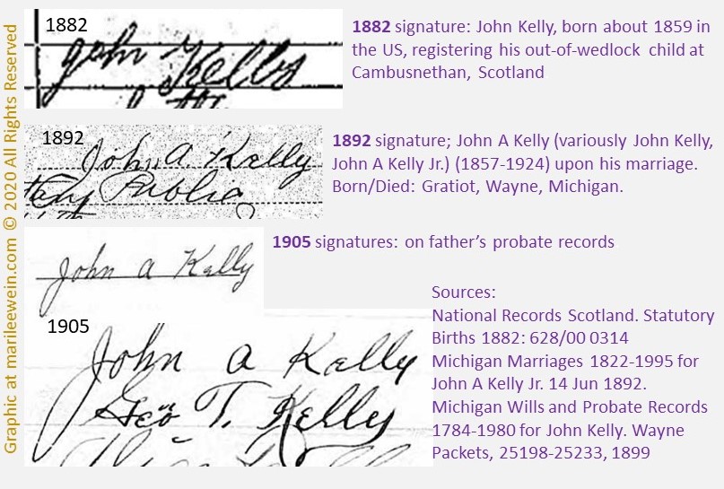 Sometimes he used “Jr”. His father was party to the marital record, in which he was distinguished as Sr. While Jr. is missed on the 1892 specimen shown, it appears on a companion piece, which however, is not included as it could not be ruled out, a copy (in those days, in another’s writing). As to the probate pieces, the “A” was required since the will specified the beneficiary as John A Kelly.