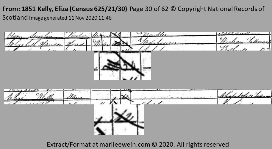 Of the Hanson children, Sarah was 11, Agnes 7, Richard 5 and Thomas 2. It said that Thomas was born in Chapelhall. Our interest, though, was in Eliza Kelly. She was posted as Mrs. Hanson’s daughter, also born in Chapelhall.