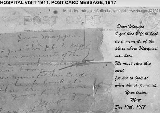 However, as dear as Matt’s postcard to Maggie was, there had been three trips to that hospital in 1911. Margaret Naysmith Alexander lost her step-father, Dugald Mitchell, in June 1911, just the week after his last child, Jemima, was born to his wife, Margaret Donaldson Baxter. It was still just three months after Margaret Henrietta Hemmingsen made her appearance.
