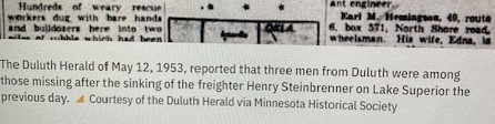 Earl Hemmingson, wheelsman, drowned with the sinking of the freighter SS Henry Steinbrenner, on Lake Superior. It was May 11, 1953 in raging weather. The wreckage was recently located as reported on September 27, 2023, by Andrew Kreuger for mprnews.org.