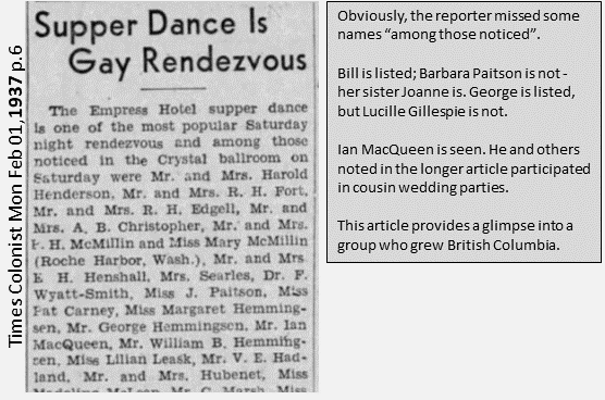 Lucille Paula Hemmingsen, born Gillespie in 1915 at Victoria B.C. Like George, she was active in her community and in the great outdoors. Lucille left in December of 2007 at 92, and John, two months later, in 2008, at 95. Bill’s Barbara passed in 2011, becoming the last in this line of extraordinary cousins and cousin spouses. She was longest living, at age 96 3/4. George was not 60, when he left.