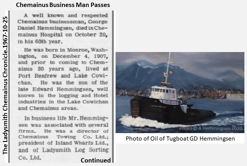 2 Norway, Emigration Records, 1867-1960 / Trondheim Politikammer 1911-1916, for Anna Hemmingsen. Also for Georg Hemmingsen. Date 12 Aug 1914 from Trondheim to New York via England, aboard Stjerne. New York, U.S., Arriving Passenger and Crew Lists (including Castle Garden and Ellis Island), 1820-1957 for Anna Hemmings. From Liverpool on 20 Aug 1914 with arrival in NY on 29 Aug aboard Adriatic. They gave a home address in Seattle. She and George are listed on the page for US Citizens, noting her husband was born in Wisconsin, in 1882! / 3 Dairy farming was confirmed by US Census and WW II Draft Registration information. / 4 The Victoria Daily Times, Tue April 18 1933. Page 5 New Riverside Inn Now Open. / 5 U.S., Evangelical Lutheran Church in America, Swedish American Church Records, 1800-1947 at Ancestry.com for Geo. Hemmingsen. / 6 Ladysmith-Chemainus Chronicle Aug 13, 1975 Page 18, Funeral Notices; Baillie. / 7 Murals at Muraltown.com https://muraltown.com/mural-art-gallery/15-chemainus-tug-boat https://muraltown.com/mural-art-gallery/28-3-climax-engine/ 8 1946 Times Colonist Thursday Sep 26 1946 Page 5, 5 Island Companies, 22 Elsewhere In B.C., formed during week. Chemainus Towing Co. Ltd. $10,000 Duncan.