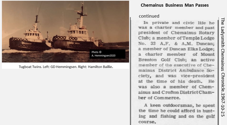 The tugboat GD Hemmingsen and its twin, Hamilton Baillie are pictured below working the waters around Chemainus. Their namesake owners partnered in both Chemainus Towing Co. Ltd. and Ladysmith Log Sorting Co. Ltd.6