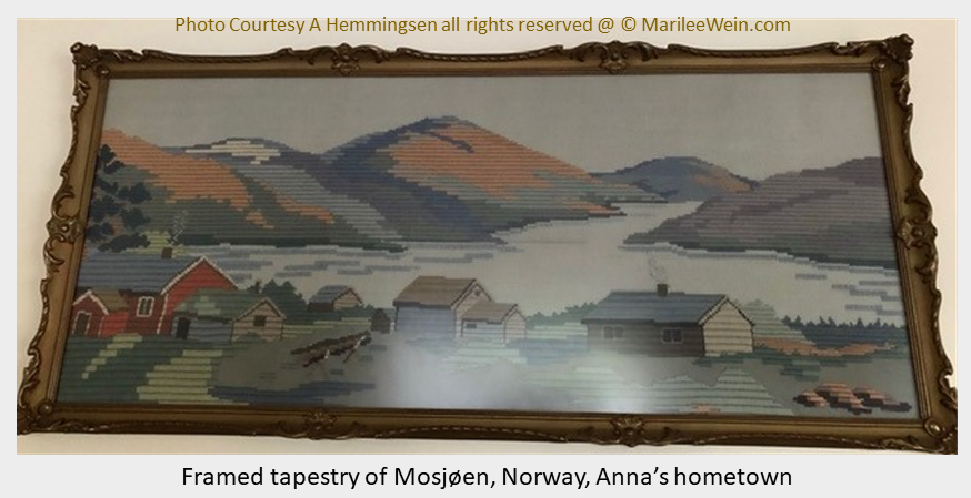 George grew up with this tapestry of Mosjøen, Norway – Anna’s birthplace and hometown. Ed was born in Hattfjelldal, less than 50 miles away. The towns are in Inner Helgeland Region.